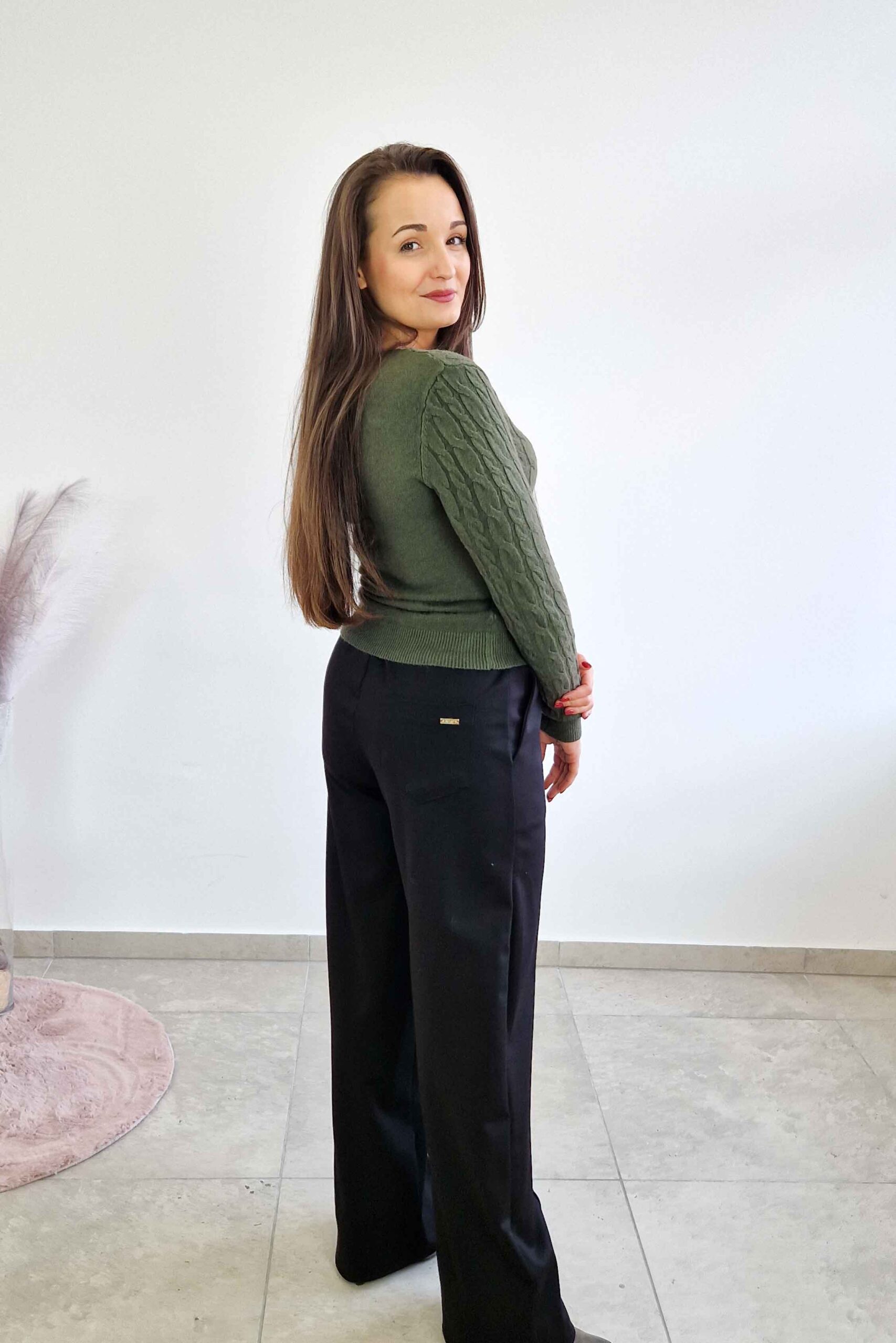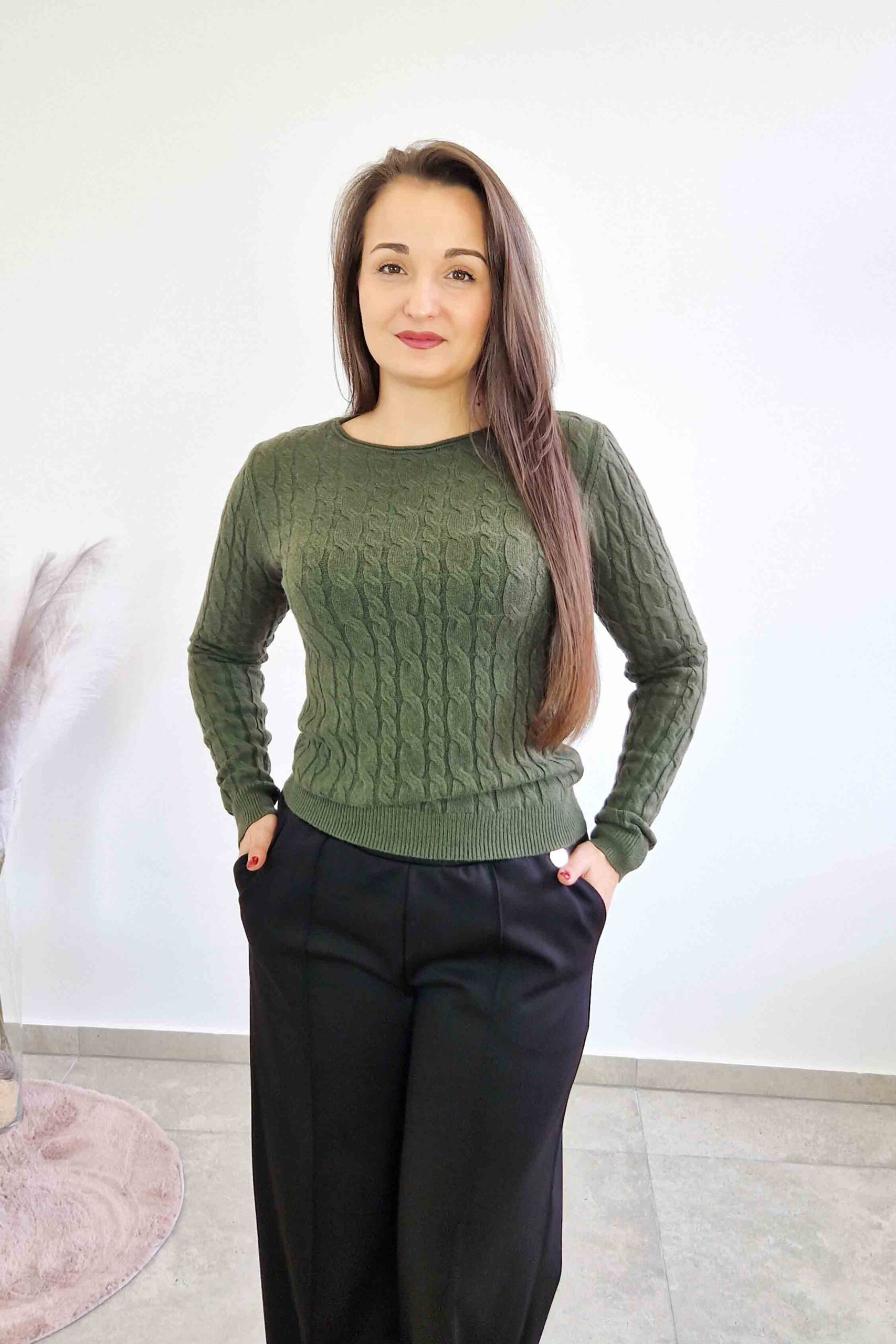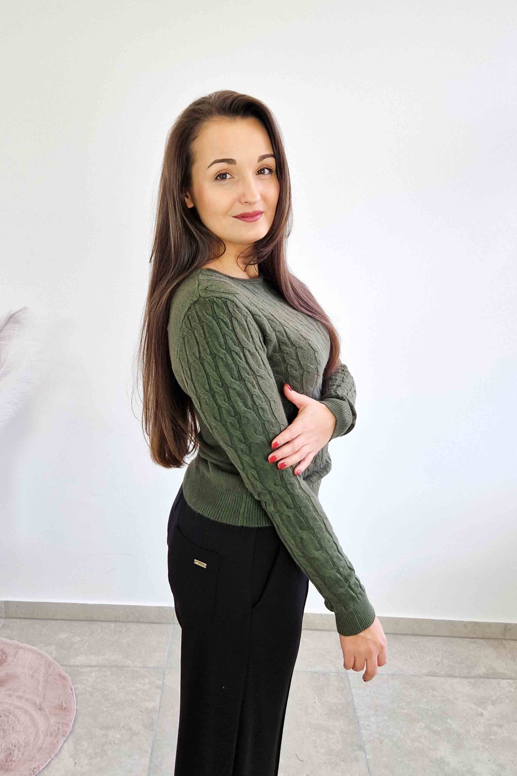Sweter Damski ze Splotem Warkocz Długi Rękaw Oliwkowy