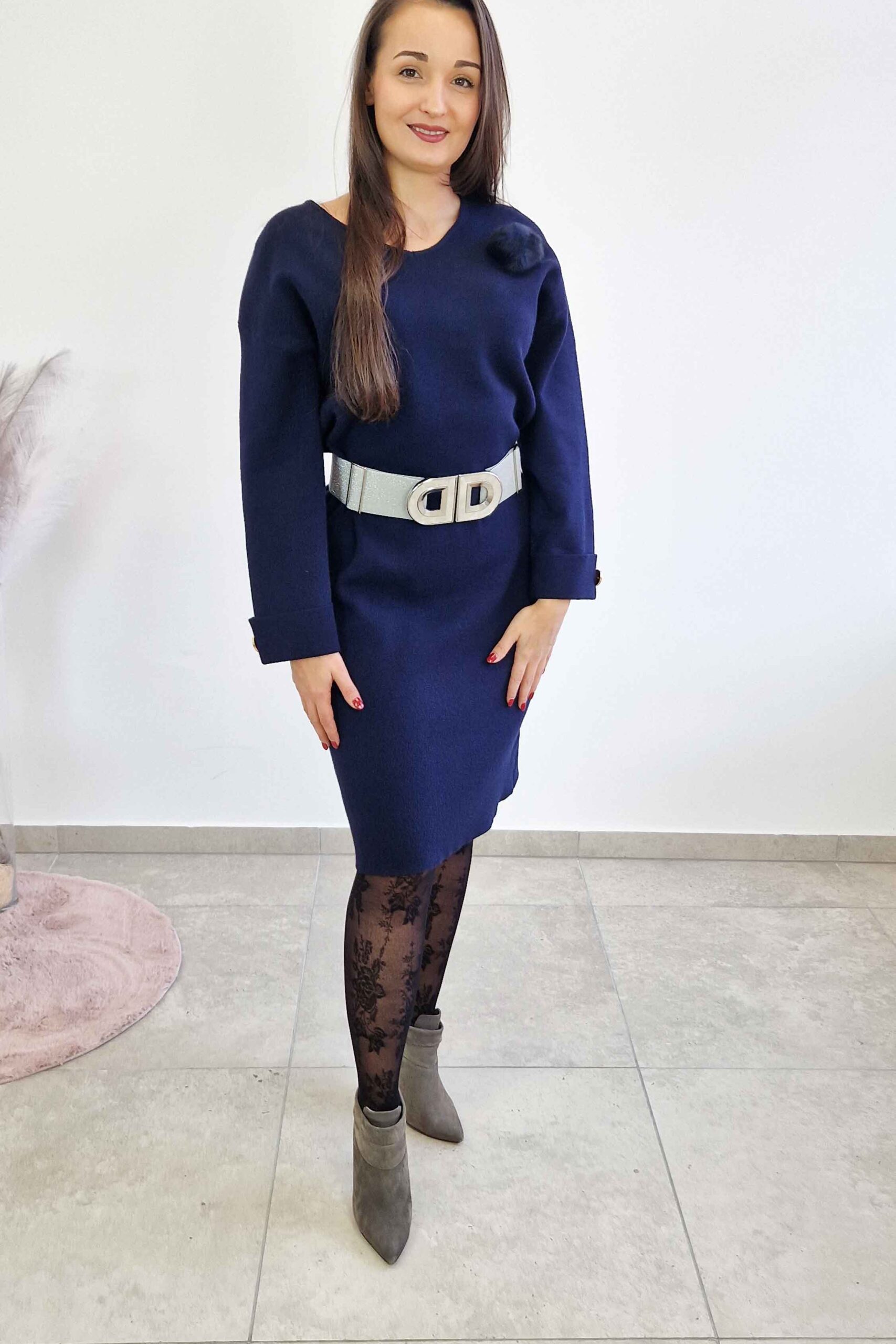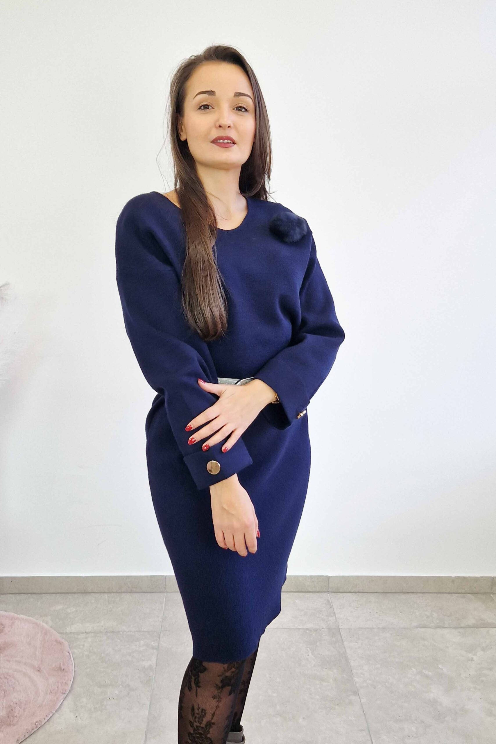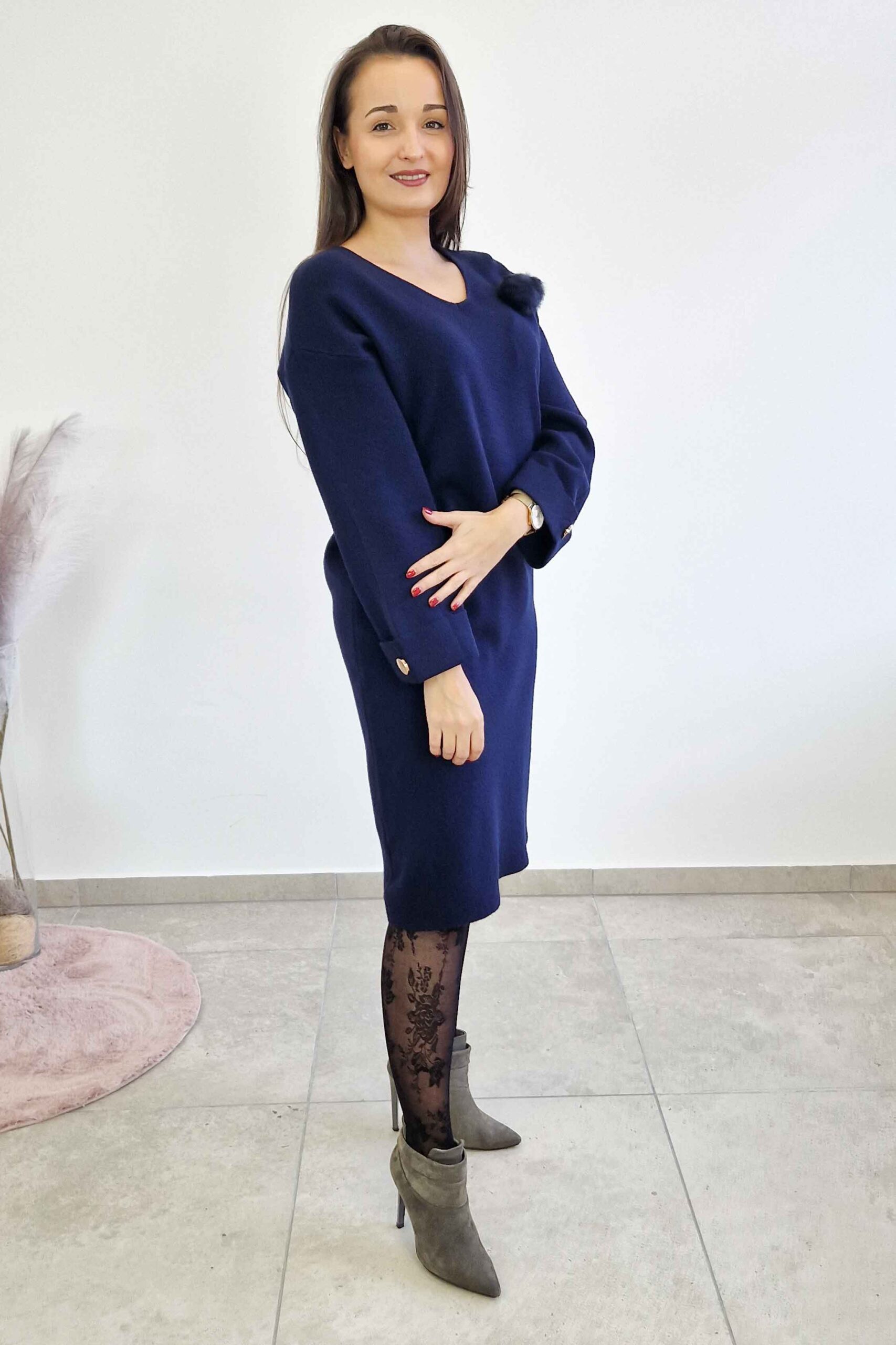 Ta sweterkowa sukienka midi to kwintesencja kobiecej elegancji w casualowym wydaniu. Wykonana z przyjemnej, elastycznej dzianiny z dodatkiem kaszmiru, gwarantuje komfort noszenia i miękkość, którą pokochasz od pierwszego założenia. Futerkowa broszka przy dekolcie dodaje jej wyjątkowego uroku – to detal, który subtelnie podkreśla szyk całej stylizacji.