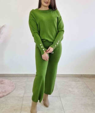 Ten sweterkowy komplet to Twoja nowa definicja domowego komfortu i miejskiego stylu. Materiał jest niezwykle przyjemny w dotyku i zapewnia ciepło, a fason doskonale się układa. Sweterek ma klasyczny krój, który zyskuje charakteru dzięki subtelnym rozcięciom na rękawach – to mały detal, który robi dużą różnicę. Spodnie damskie z elastycznym pasem i szeroką nogawką są niesamowicie wygodne i bardzo modne.
