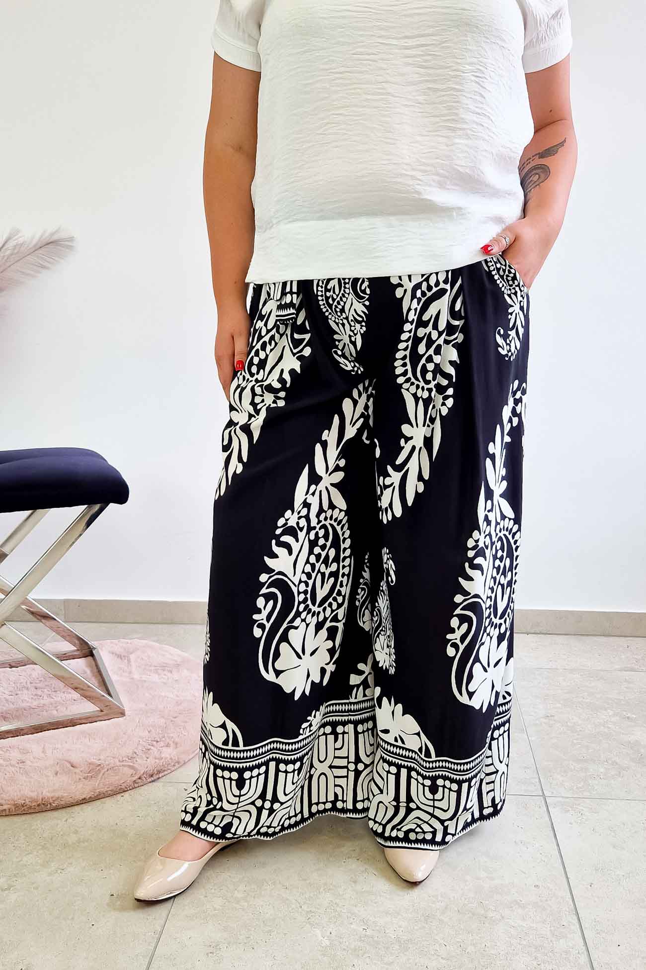 Te zwiewne spodnie damskie świetnie wpisują się w styl casual z nutą boho. Szerokie nogawki tworzą efektowne, lekkie linie, które pięknie układają się podczas ruchu. Czarno-biały aztecki wzór dodaje charakteru, dzięki czemu możesz stworzyć nietuzinkową stylizację bez zbędnych dodatków. Doskonale sprawdzą się jako spodnie na lato, do pracy lub jako element eleganckiego outfitu – wystarczy dodać jednokolorową koszulę lub bluzkę basic i sandały na słupku.