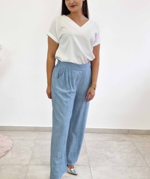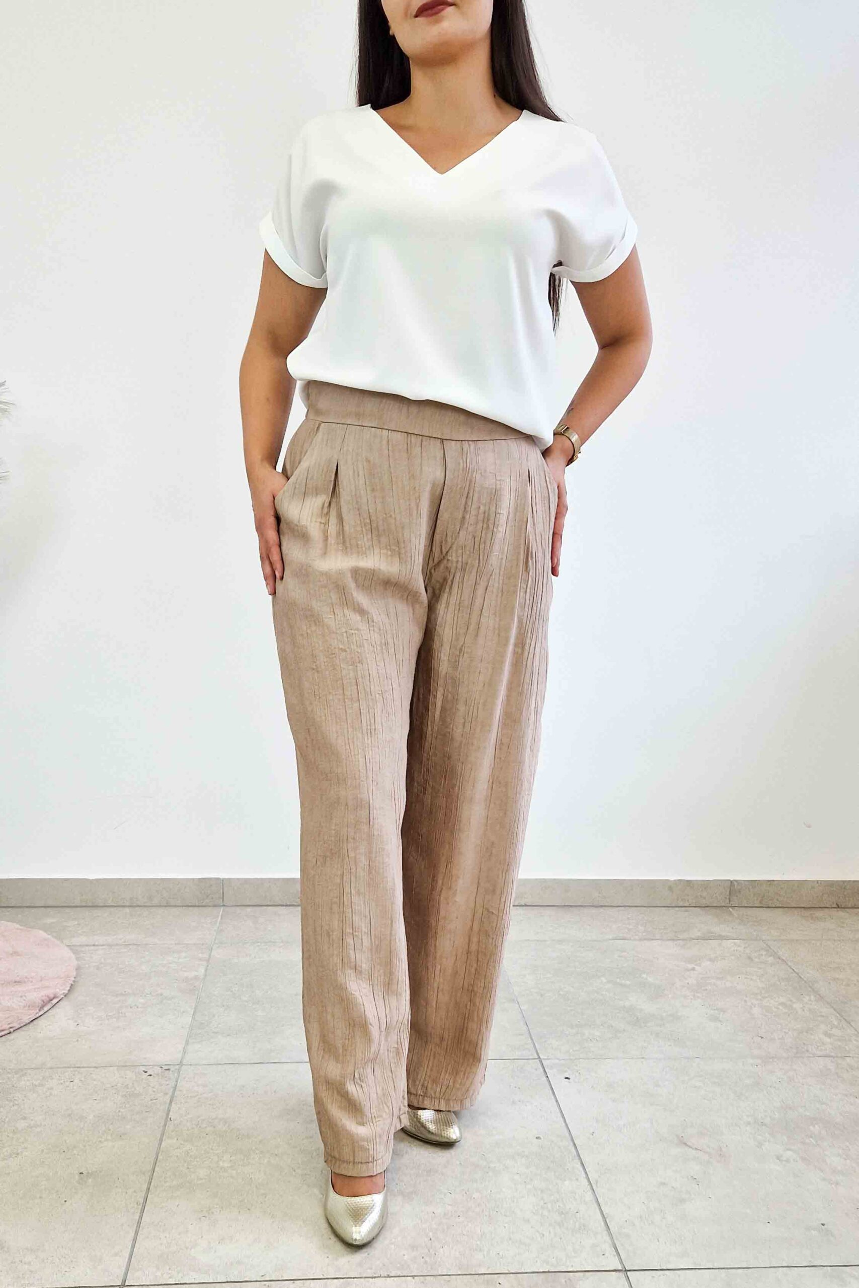 Model dostępny w dwóch klasycznych odcieniach – beżowym i niebieskim – pozwala na tworzenie wielu stylizacji. Zestaw je z prostą koszulą i mokasynami, jeśli szukasz eleganckiego looku do pracy, albo połącz z oversize’owym swetrem i trampkami, aby stworzyć luźną, casualową stylizację na co dzień. To jedne z tych spodni, które szybko staną się bazą Twoich ulubionych outfitów.
