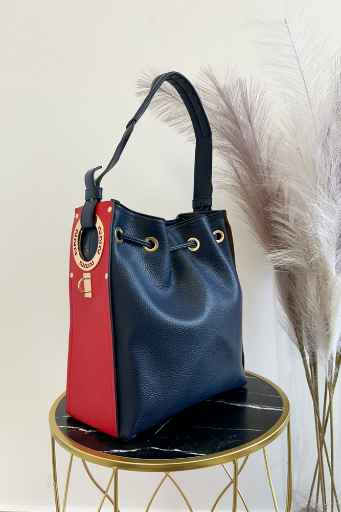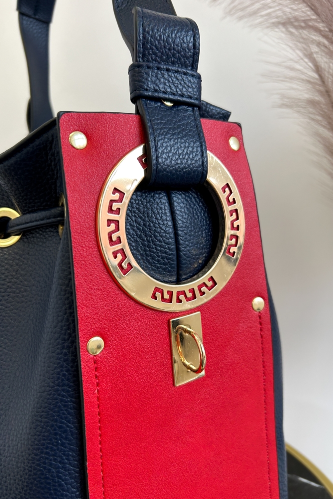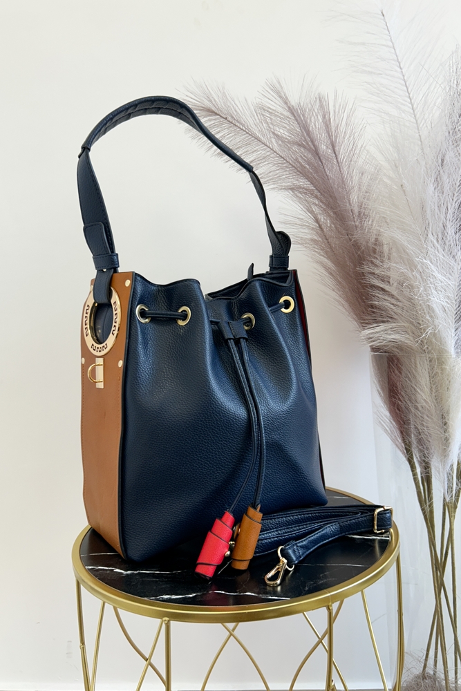 Czarno-beżowo-czerwona torebka worek na ramię to model dla kobiet, które lubią wyróżniać się odważniejszym designem. Klasyczny granat w połączeniu z kontrastowymi karmelowymi i czerwonymi elementami tworzy elegancki i ponadczasowy styl, który pasuje zarówno do casualowych, jak i bardziej formalnych stylizacji.