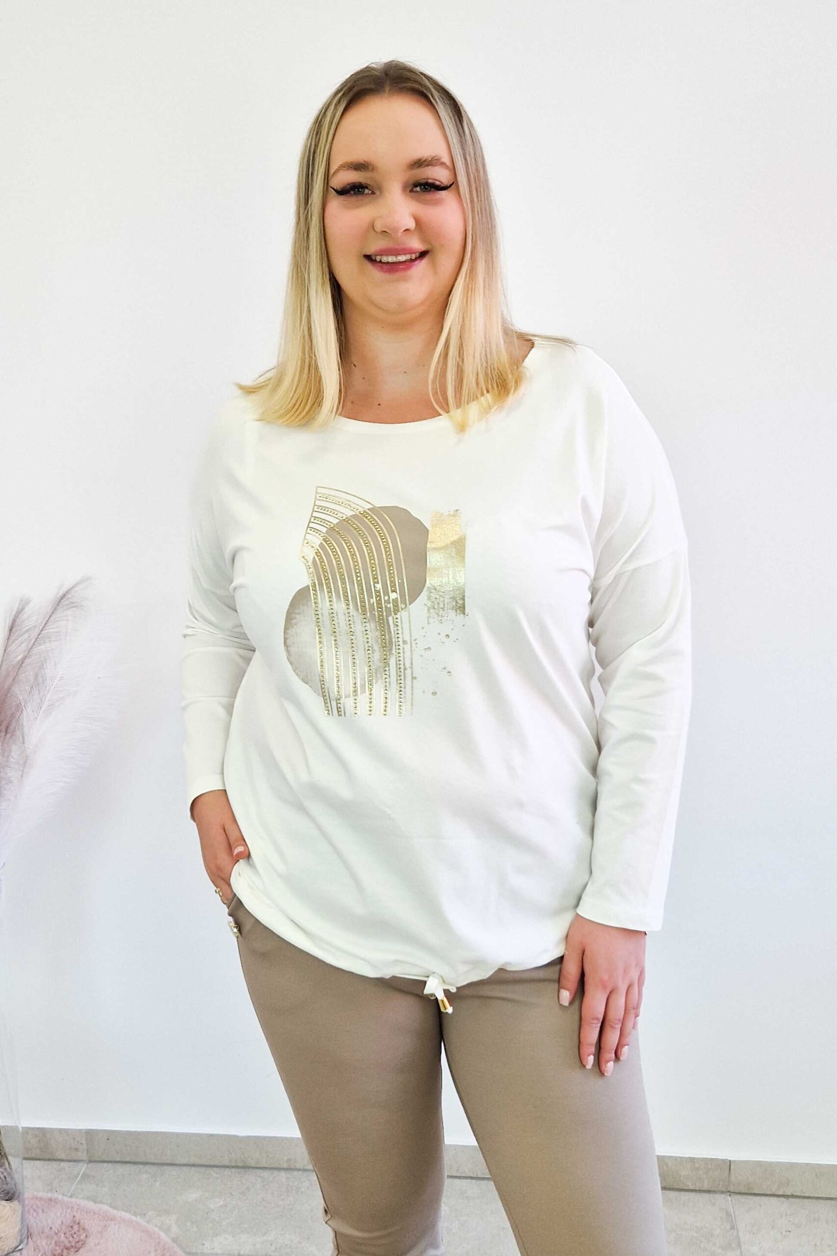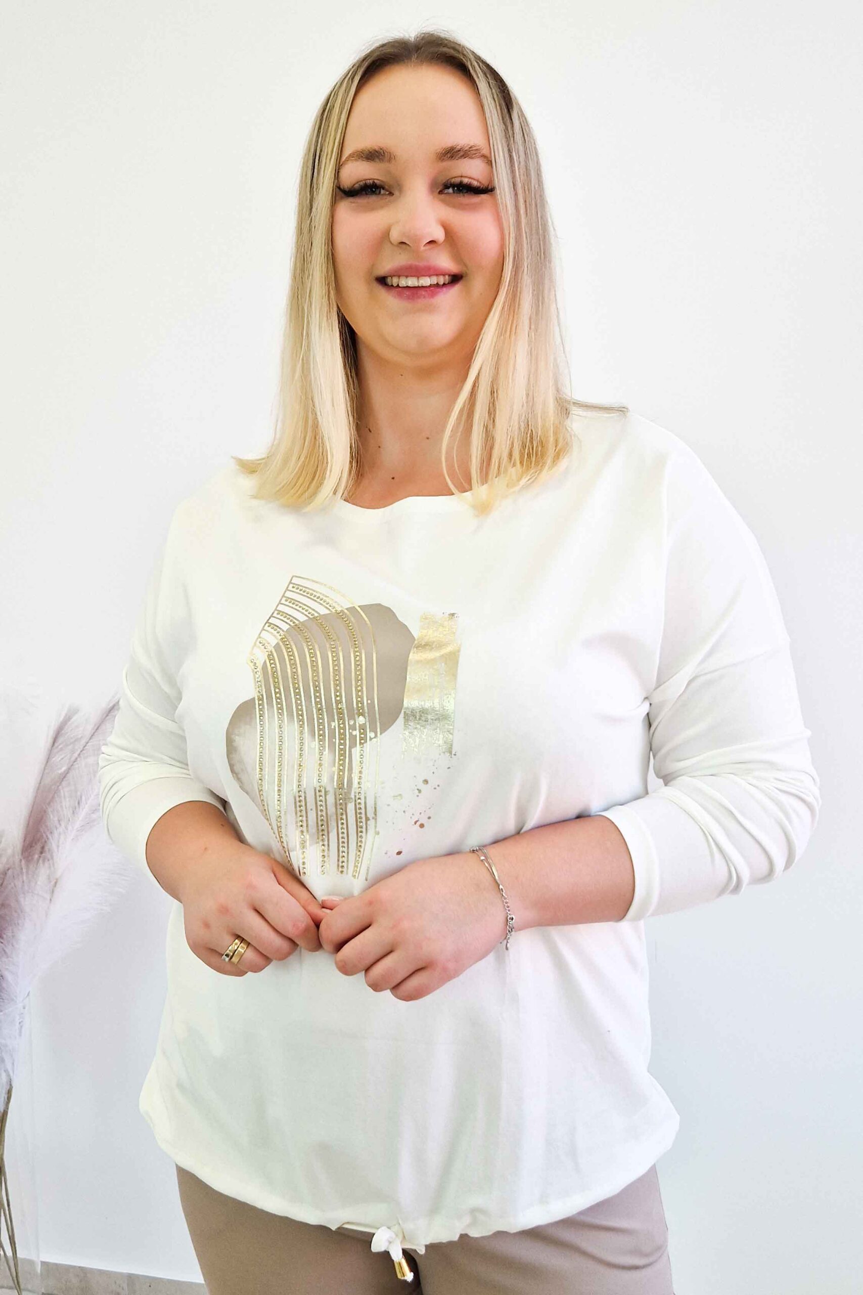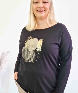 Subtelny abstrakcyjny wzór ze złotymi elementami przyciąga wzrok, a wiązanie na dole pozwala dopasować fason do sylwetki. To klasyczna bluzka na co dzień, która świetnie sprawdzi się zarówno do jeansów, jak i eleganckich spodni.
