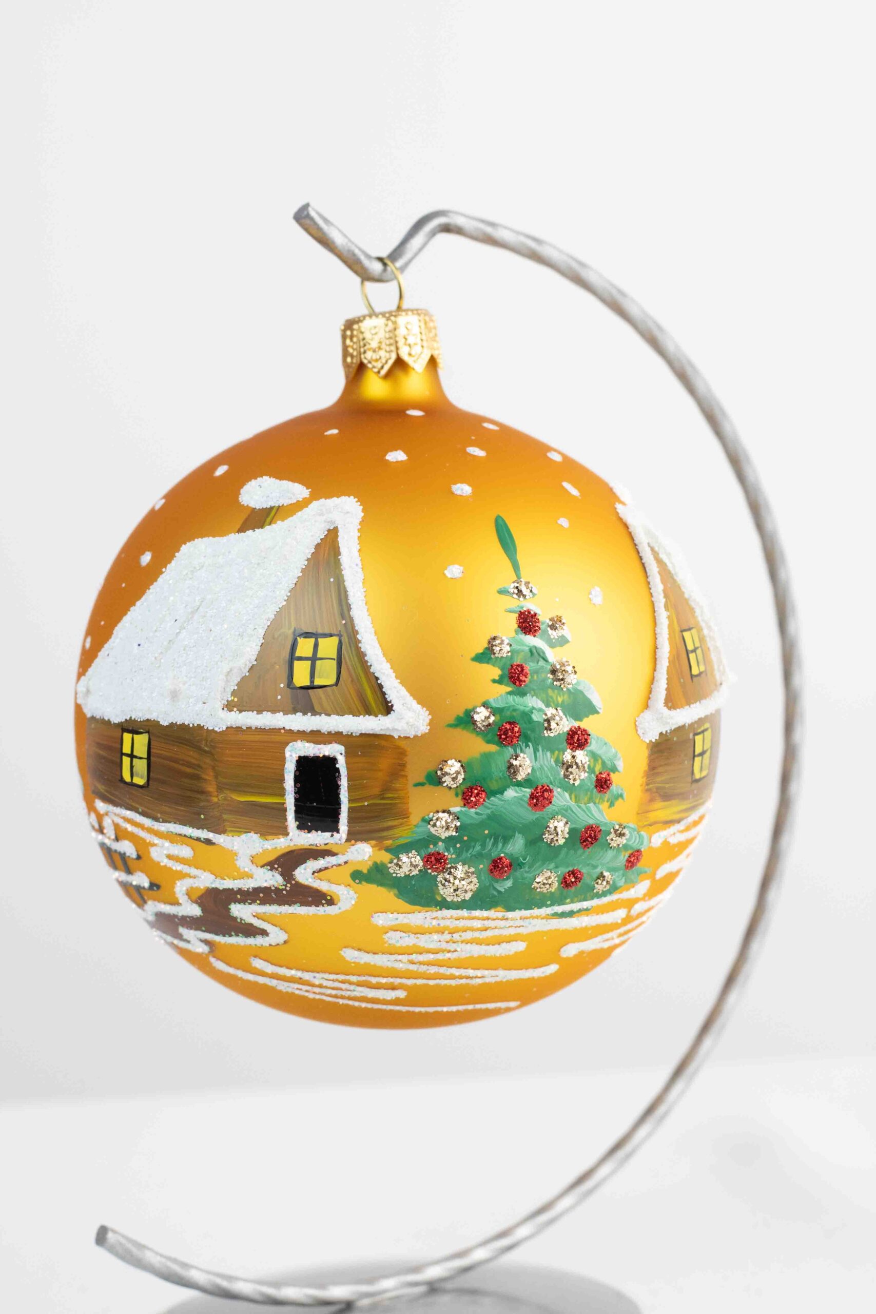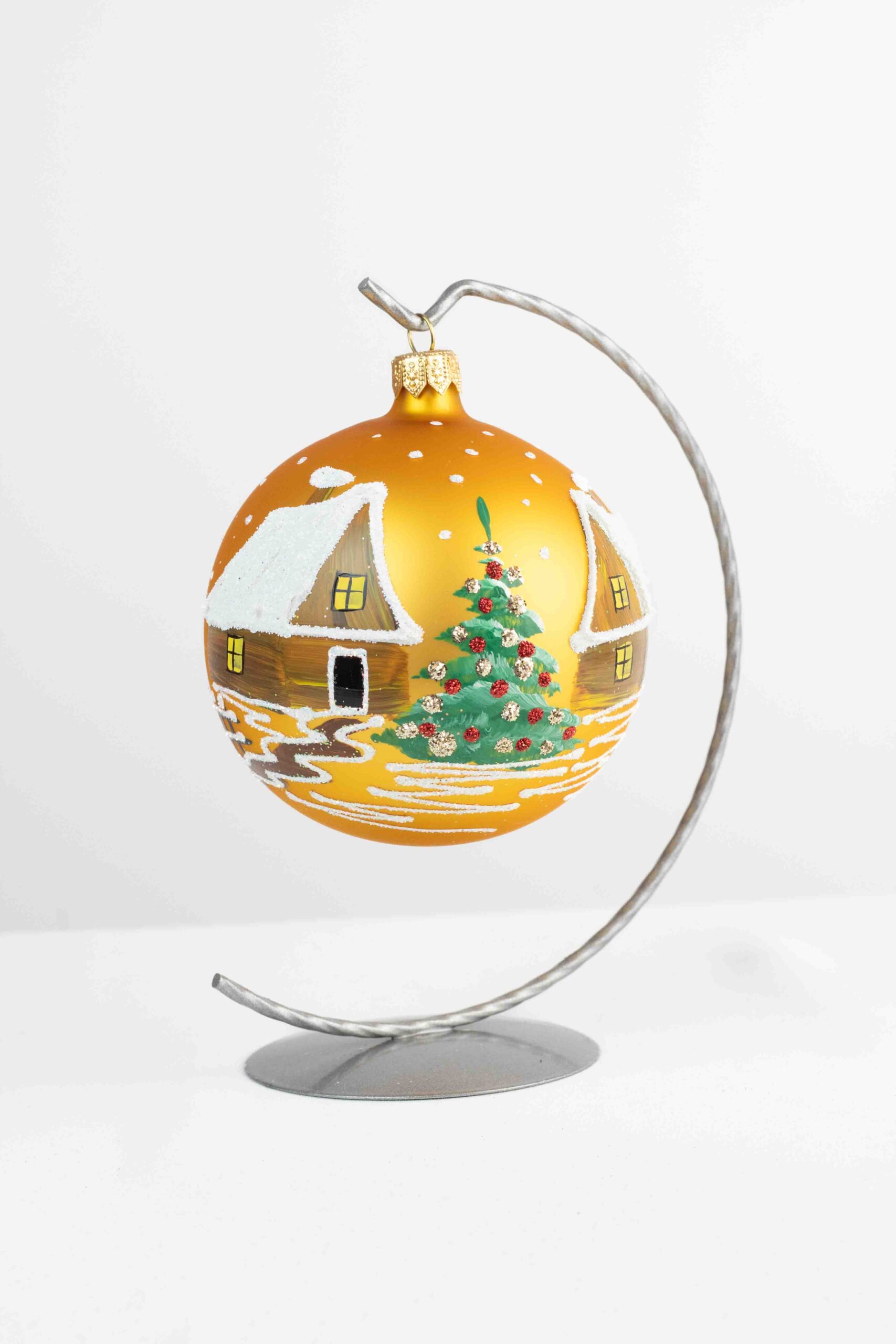 Bombka wykonana jest z wysokiej jakości szkła i umieszczona na solidnym metalowym stojaku o wysokości 17 cm, który zapewnia stabilność i elegancję całej kompozycji. Dzięki stojakowi bombkę możesz łatwo wyeksponować na półce, komodzie, parapecie lub świątecznym stole, gdzie stanie się centralnym punktem dekoracji. Jej subtelne, ręcznie malowane wzory idealnie pasują zarówno do klasycznych, jak i nowoczesnych aranżacji, dodając im wyjątkowego uroku.